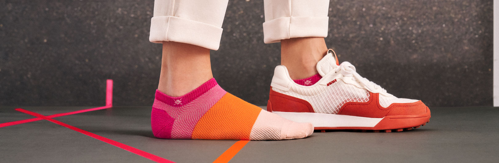 I calzini da donna Montrose sono assai belli. Un colore per la suola, le dita dei piedi e il polsino, un altro per il resto - i due toni sono solo a una tonalità di distanza. Questi sono i tuoi calzini da sneaker per i giorni in cui altrimenti si diventa troppo colorati. Tuttavia femminili: le calze hanno un piccolo volant sul polsino.