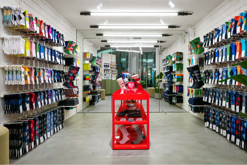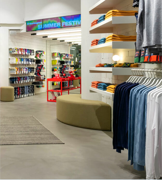 The Burlington Store in the city centre has a sales area of 32 sqm. Our selection of socks centres on the traditional Scottish Argyle pattern, and particularly on the current fashion collection with slogans and patches, all in vibrant shades typical for the Burlington look.